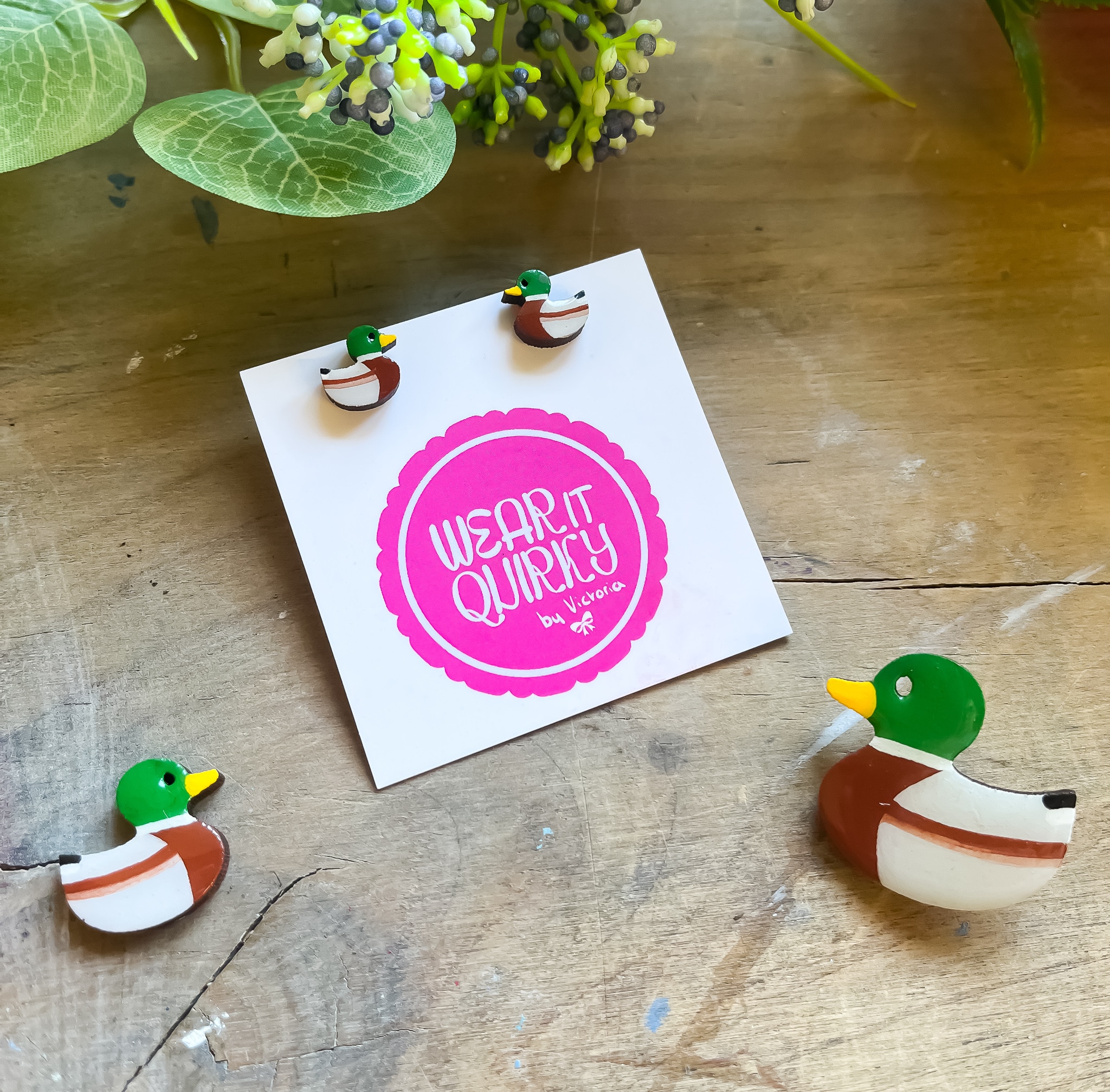 The Mini Mallard Duck Stud Earrings are made from eco-friendly wood and can be attached to surgical steel or sterling silver posts.