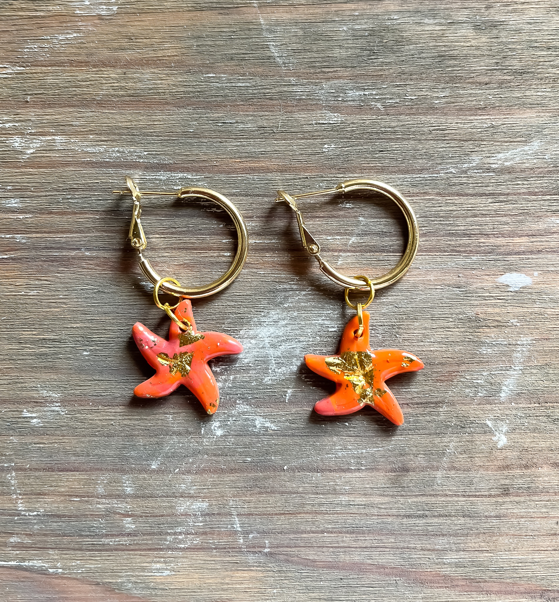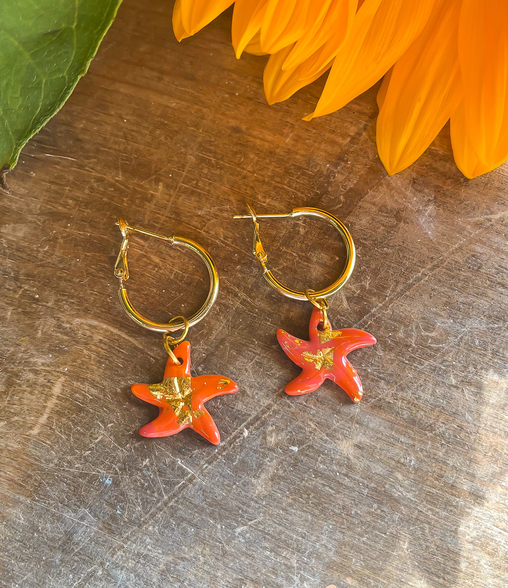 Super cute Orange Starfish Dangle Earrings made from orange polymer clay with additional gold flakes.