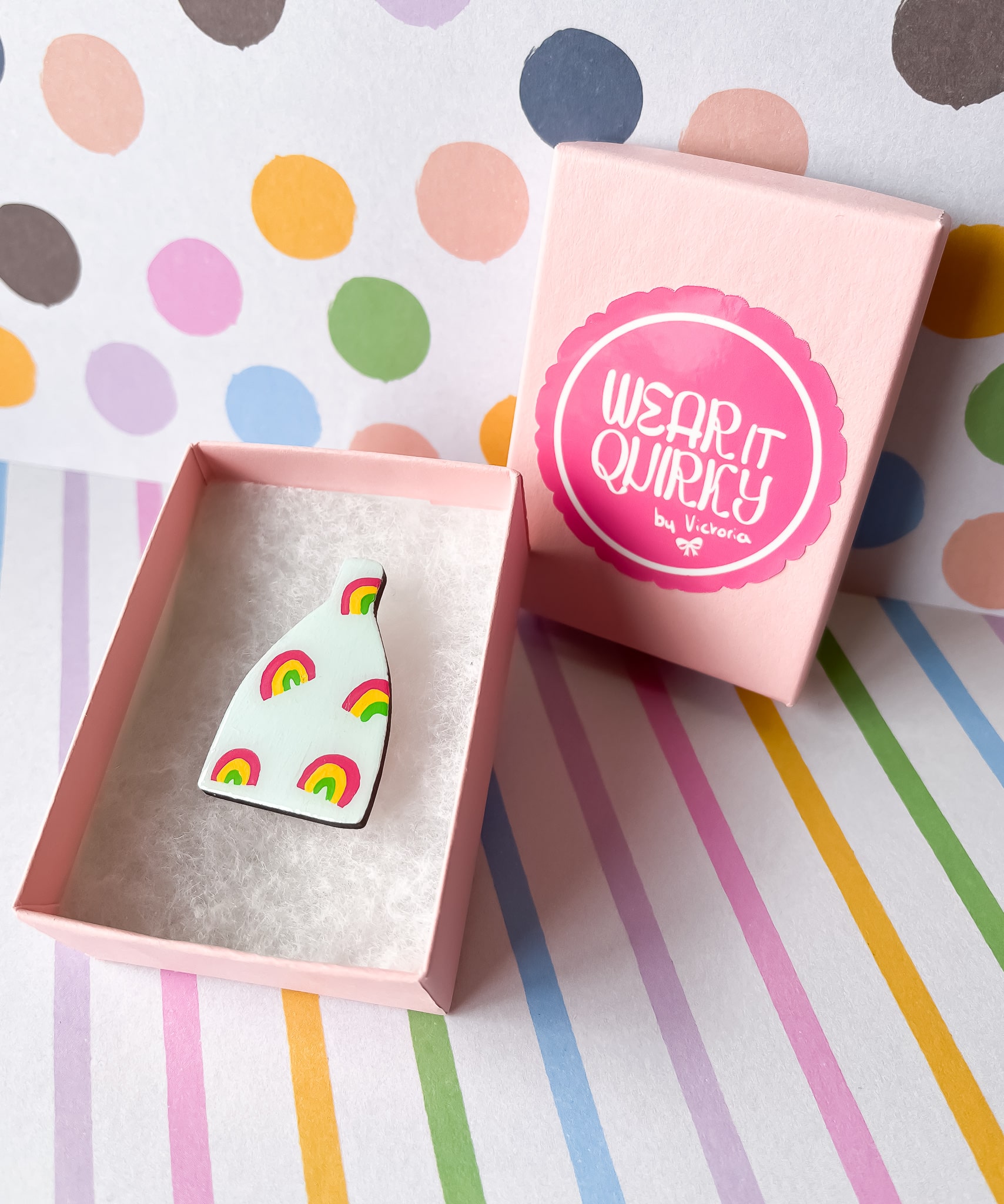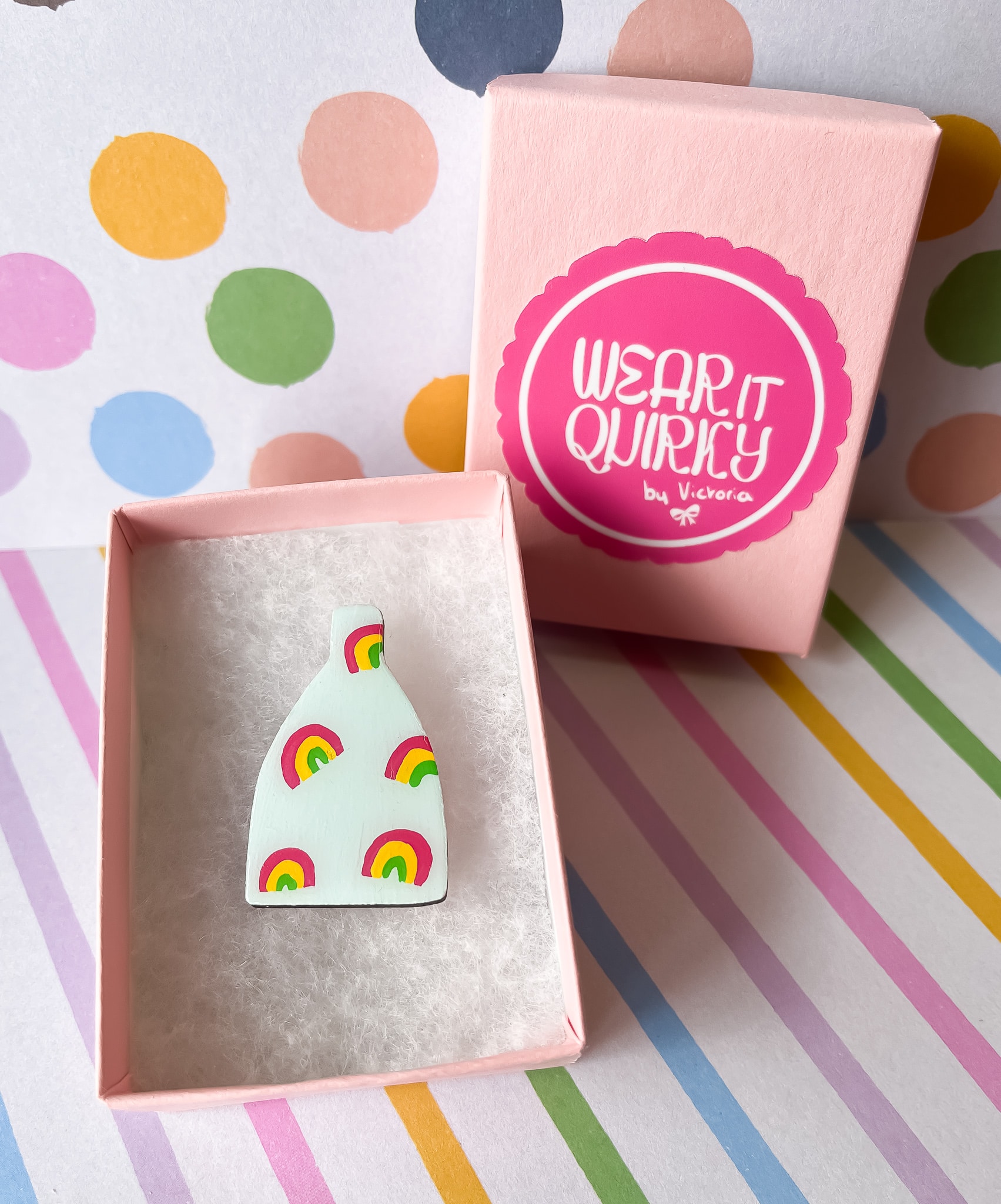 The Rainbow Bottle Kiln Brooch is made from laser cut wood which has been painted by hand.