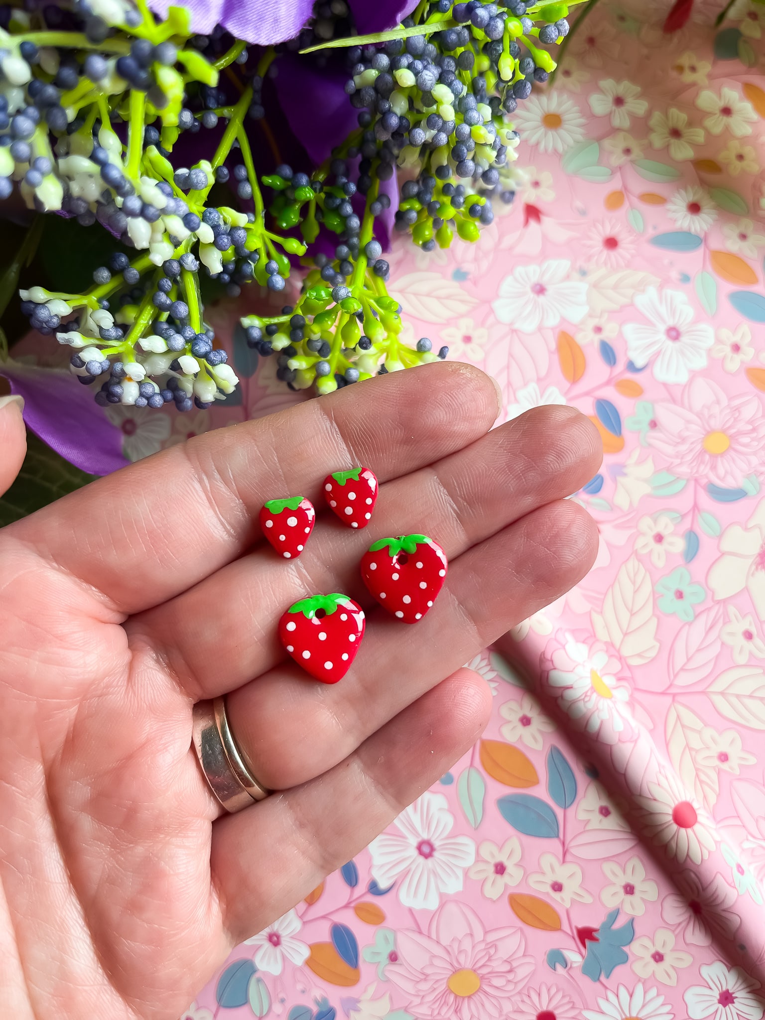 Cute Strawberry Dangle Earrings made from polymer clay which has been hand painted on to represent cute, delicious strawberries.