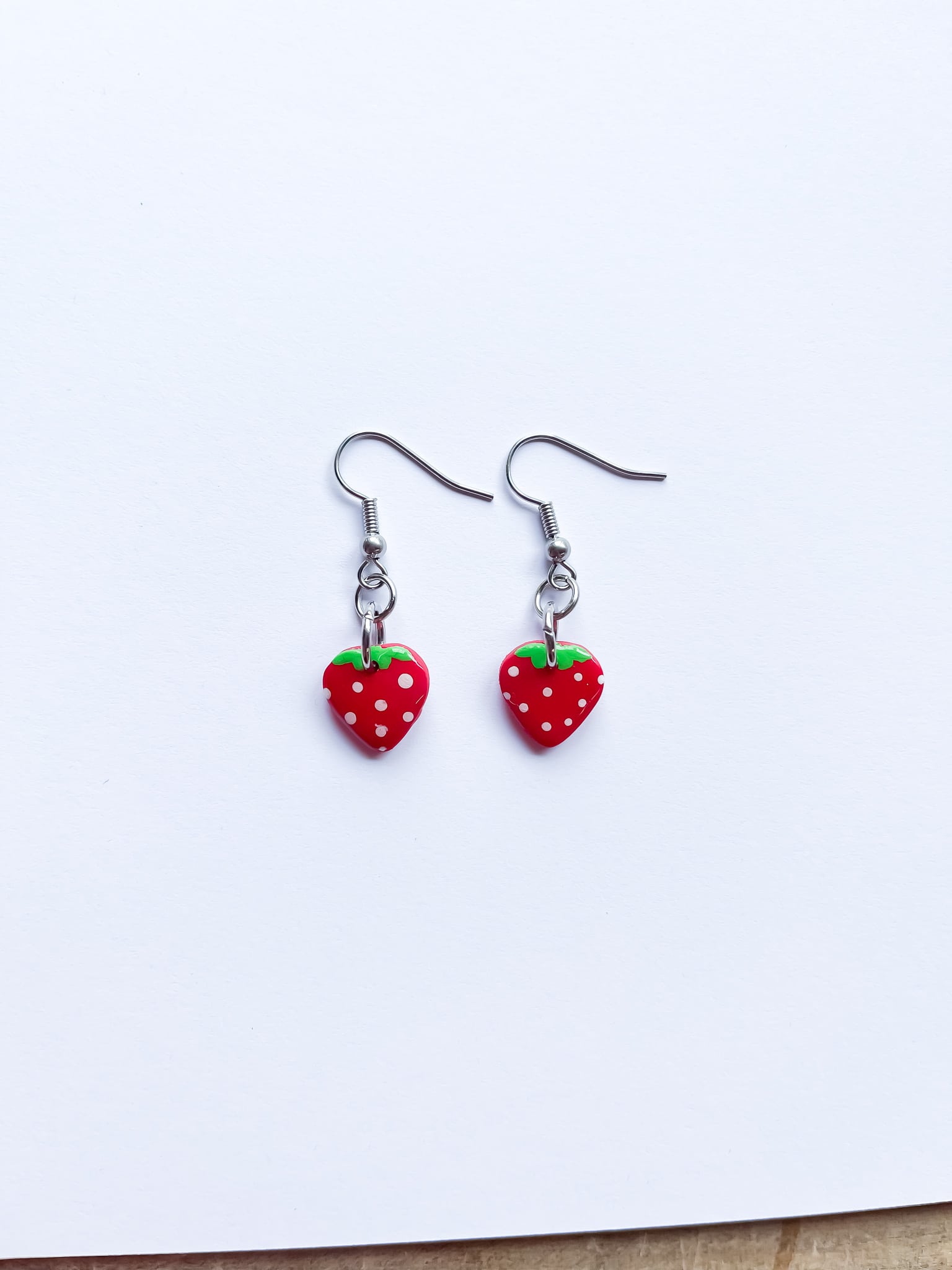 The Strawberry Dangle Earrings are made from polymer clay which has been painted by hand. They have the strawberry detail to the front and then are just red on the back.
