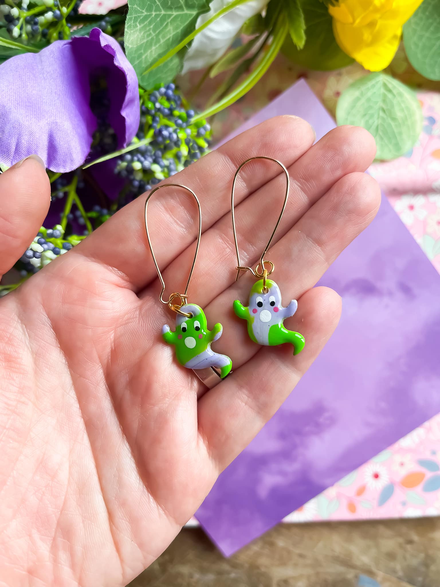 The Summer Ghost Dangle Earrings are made from polymer clay which has been painted by hand on the front.